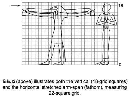 تُحدد التماثيل المصرية بدقة - باستخدام عصابة رأس أو تاج أو إكليل أو مفصل - خطًا فاصلًا لأعلى جمجمة الإنسان ليفصل بذلك تاج الجمجمة. ويُقاس طول الجسم دون احتساب التاج كما هو موضح في هذه الشبكة المصرية القديمة.