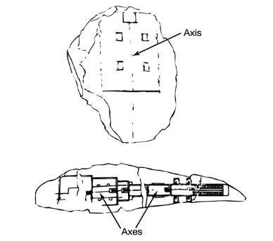 وفي المباني نفسها يتم تحديد المحور بخط محفور على أحجار الطبقة العلوية من بلاطة الأساس كما هو الحال في معبد الأقصر.