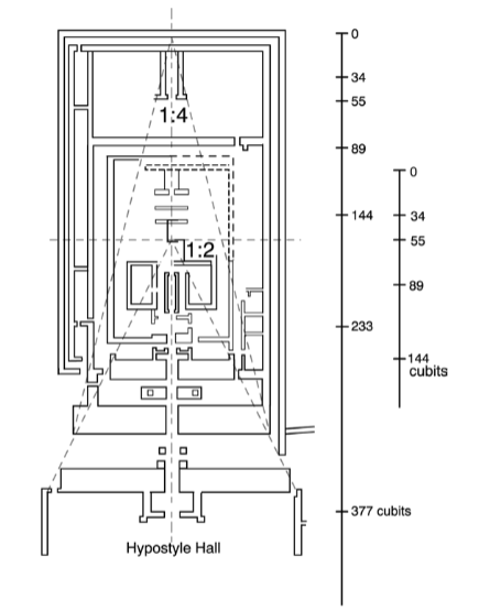 إن تصميم المعبد المصري النموذجي يزداد عرضه وارتفاعه من المحراب ونحو اتجاه الواجهة. هذا التحديد الشامل مبني على "نظام تلسكوبي" للتصميم منذ عصر الدولة القديمة. إن الزيادة في العرض تتم باستخدام مثلثات متتالية بنسب 1:2 و1:4 و1:8 من نقطة رئيسية واحدة أو أكثر. (انظر إلى التصميم الجزئي لمعبد الكرنك أدناه.)