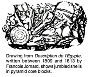 الرسم من كتاب "وصف مصر" الذي كتبه فرانسوا جومارد بين عامي ١٨٠٩ و١٨١٣، ويظهر أصدافًا مختلطة في تكوين أحجار الهرم. تتكون هذه الأهرامات أساسًا من الحجر الجيري ذو الصدف الأحفوري، وهي مادة غير متجانسة يصعب قطعها بدقة.